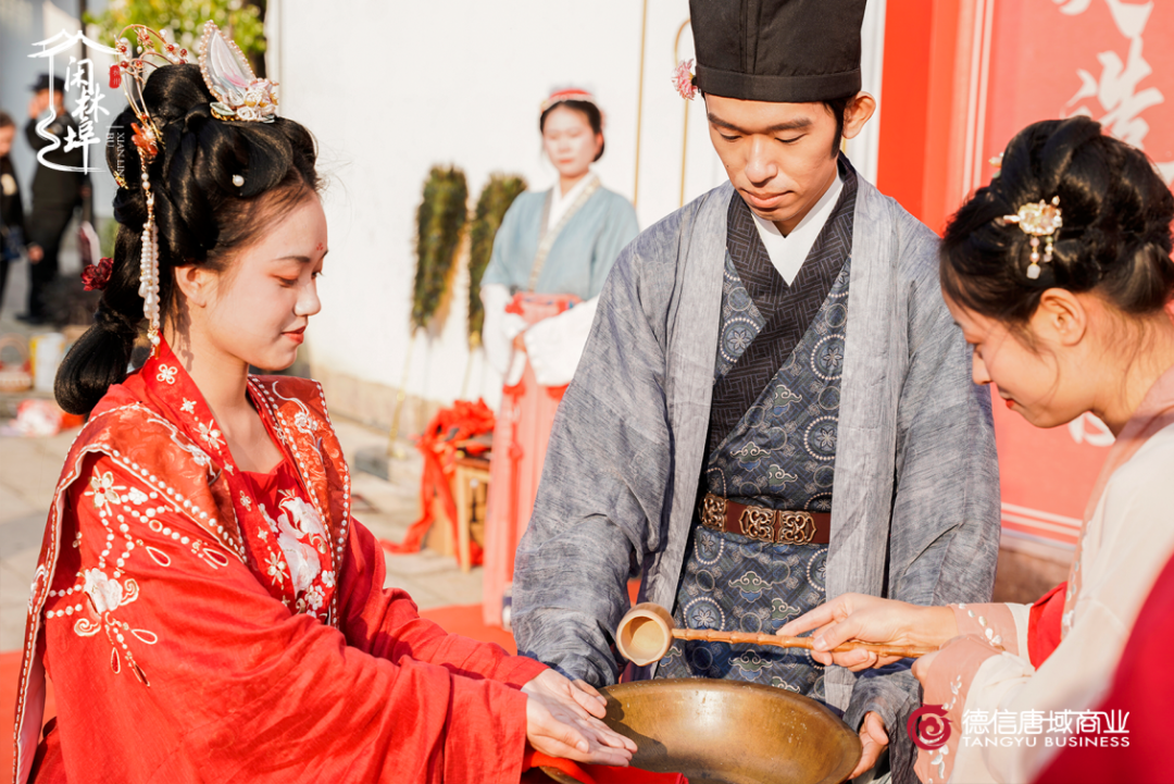 喜船靠岸后,新人们行至本次活动的主会场。揭红盖头、签署婚书、行宋式“合卺”之礼…传统文化赋予婚嫁独特的魅力,而“水乡婚礼”作为梦溪水乡民俗风情一块极为重要的内容,保护和传承意义重大。