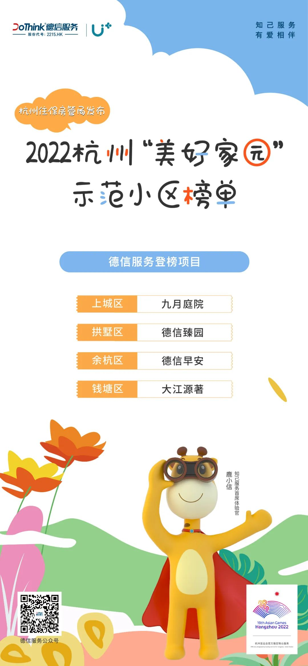 11月14日,杭州市住保房管局公布2022年“美好家园”示范小区评选结果。德信服务在管4个项目荣耀上榜,分别是,拱墅区德信臻园、上城区九月庭院、余杭区德信早安、钱塘区大江源著。