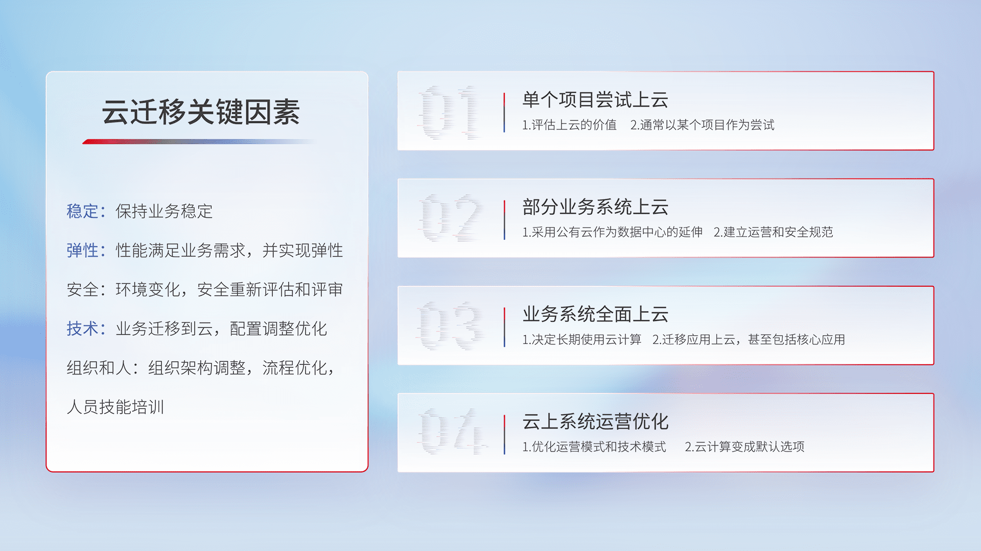 结合实际业务,,,从规划设计、、、、云平台选型、、、、云原生改造、、、数据迁移、、集成交付,,迁移全过程为客户识别最佳上云路径,,,,做好风险识别管理,,,,设计网络架构、、身份权限、、安全审计合规、、操作审计、、、日志审计、、、监控告警策略、、多站点容灾设计等,,,对云上基础设施进行整体规划,,,提升IT治理水平,,,以满足弹性、、、、高可用、、、高性能的需求。。。。