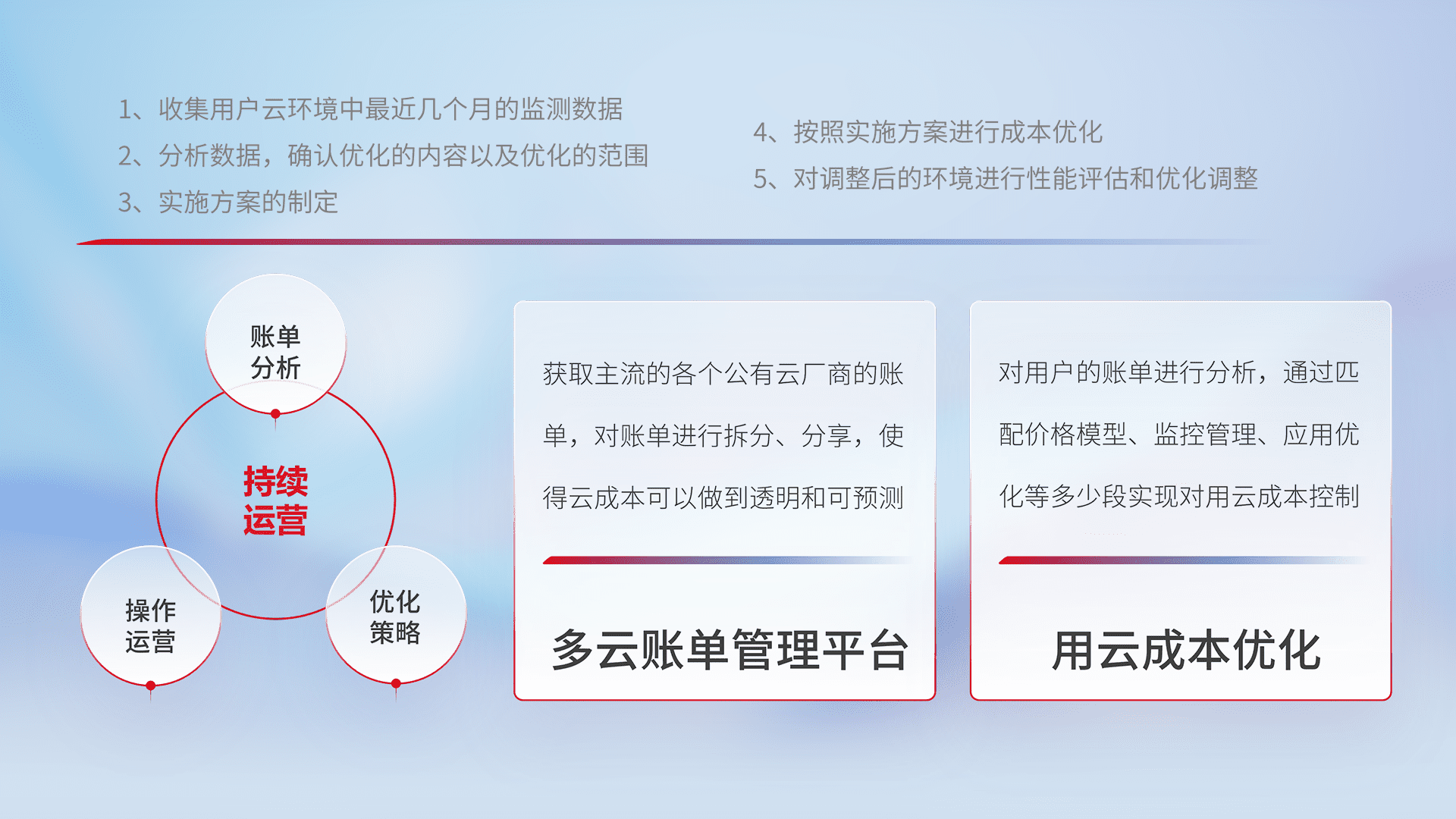 通过多云纳管,,,,以统一的资源数据模型把客户的云资源进行抽象和封装,,进而实现对多云资源的统一操作,,保障云资源管理的可靠性、、、稳定性与可用性。。量身定制化运维内容,,,配置、、、、开发运维、、、、补丁管理、、、备份、、、、监控、、、、认证和访问管理、、审计和日常巡检等,,保障在用云过程中的可靠度,,,稳定度以及高可用率。。